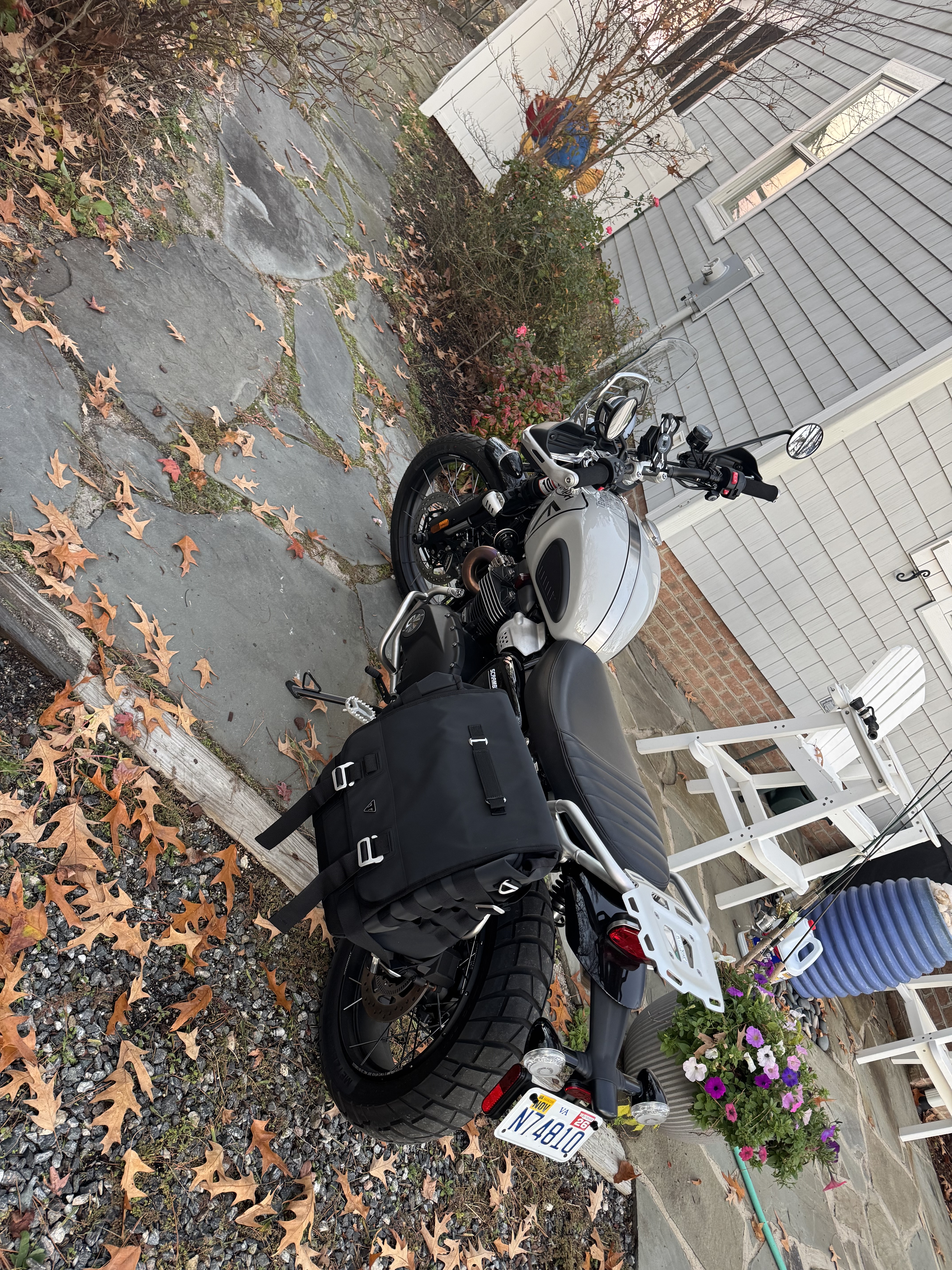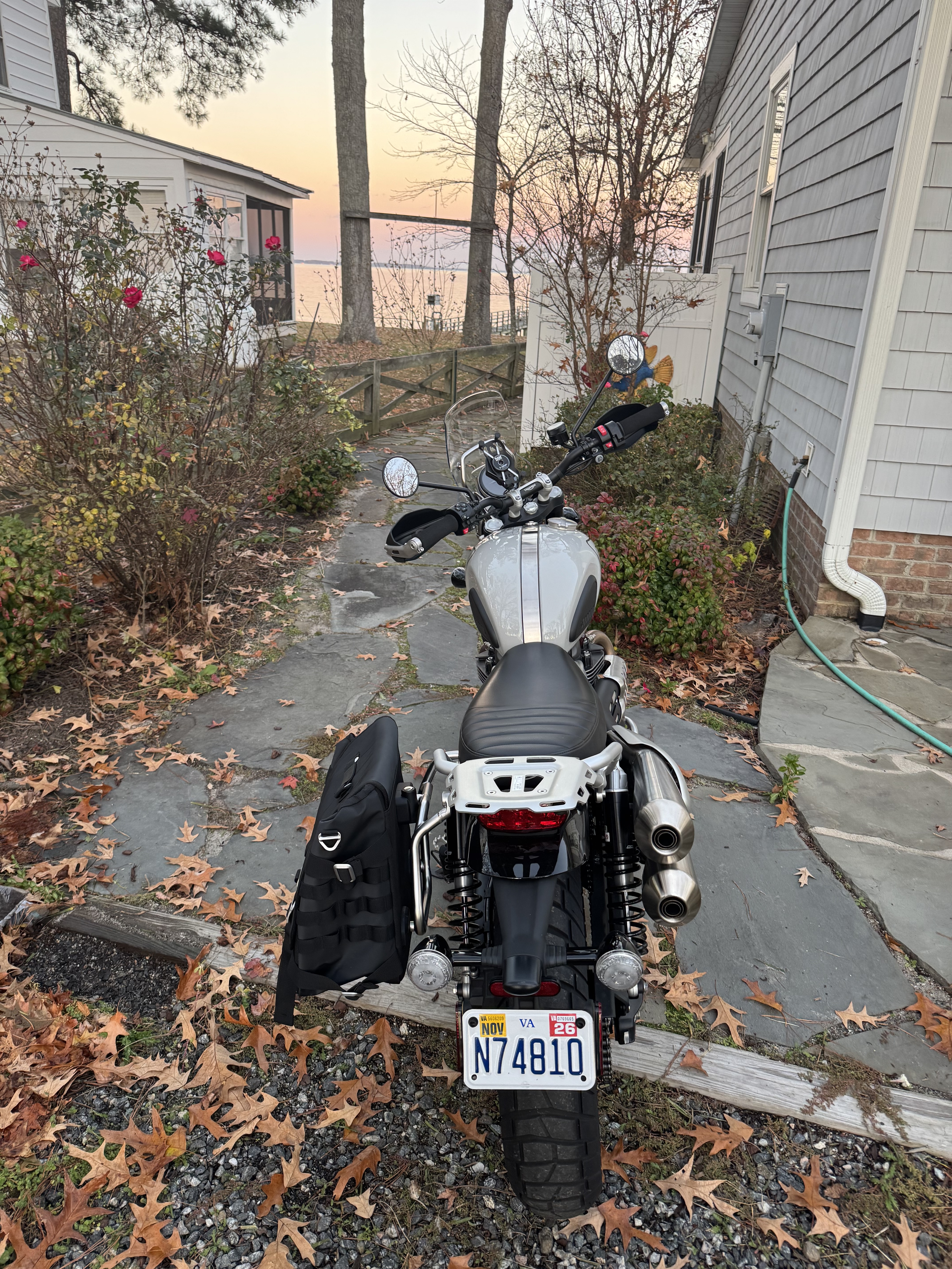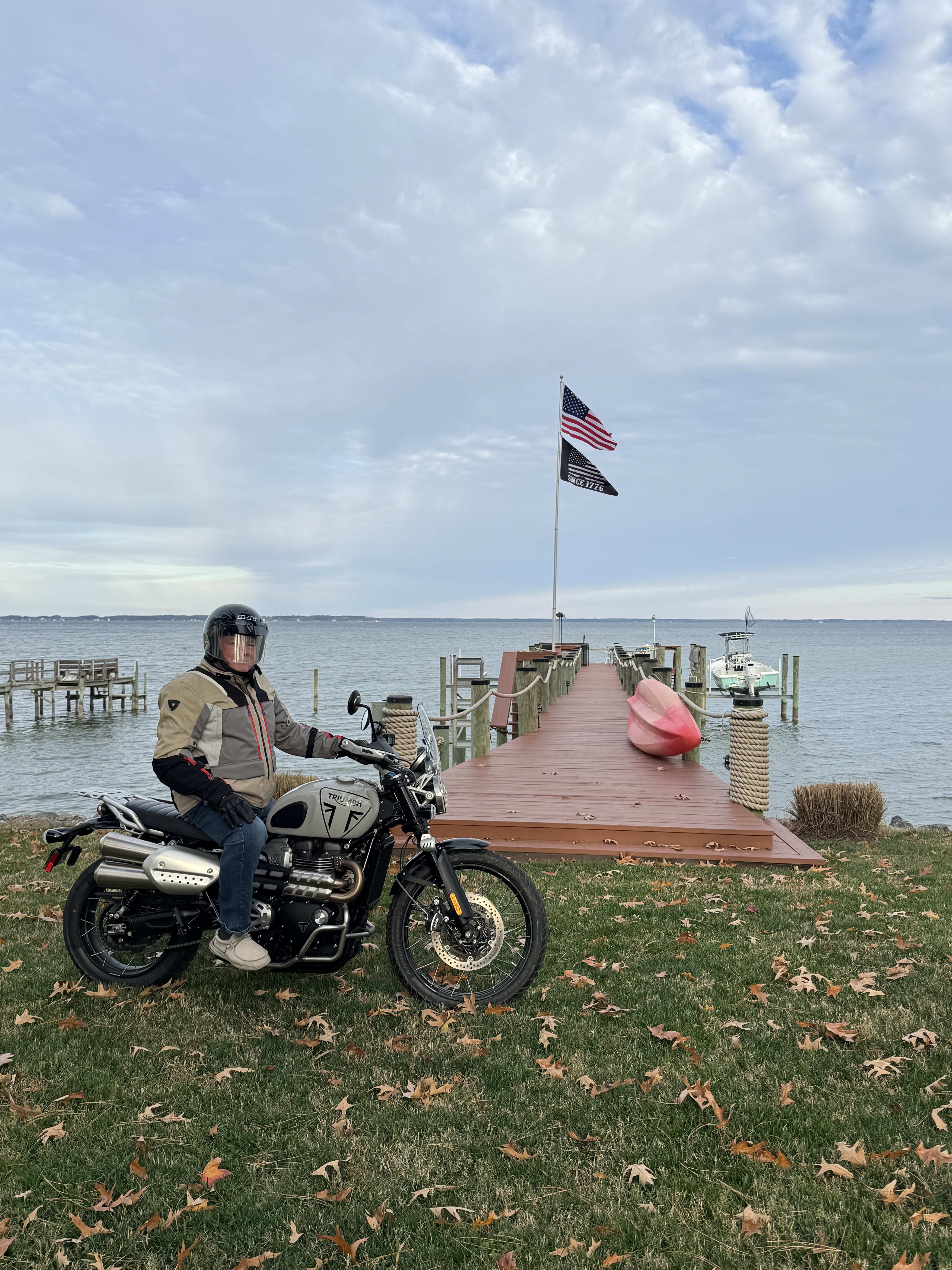 BTW, I did pick up my SMOG machine yesterday, a balmy 77 degree day before Thanksgiving in Virginia. It was a perfect day for a first ride from Richmond Triumph to our place on the Potomac River on the Northern Neck of Virginia. She (Scrambler is named La La La (tender is La La)) will be on deck on Shangri-La. Photos attached.