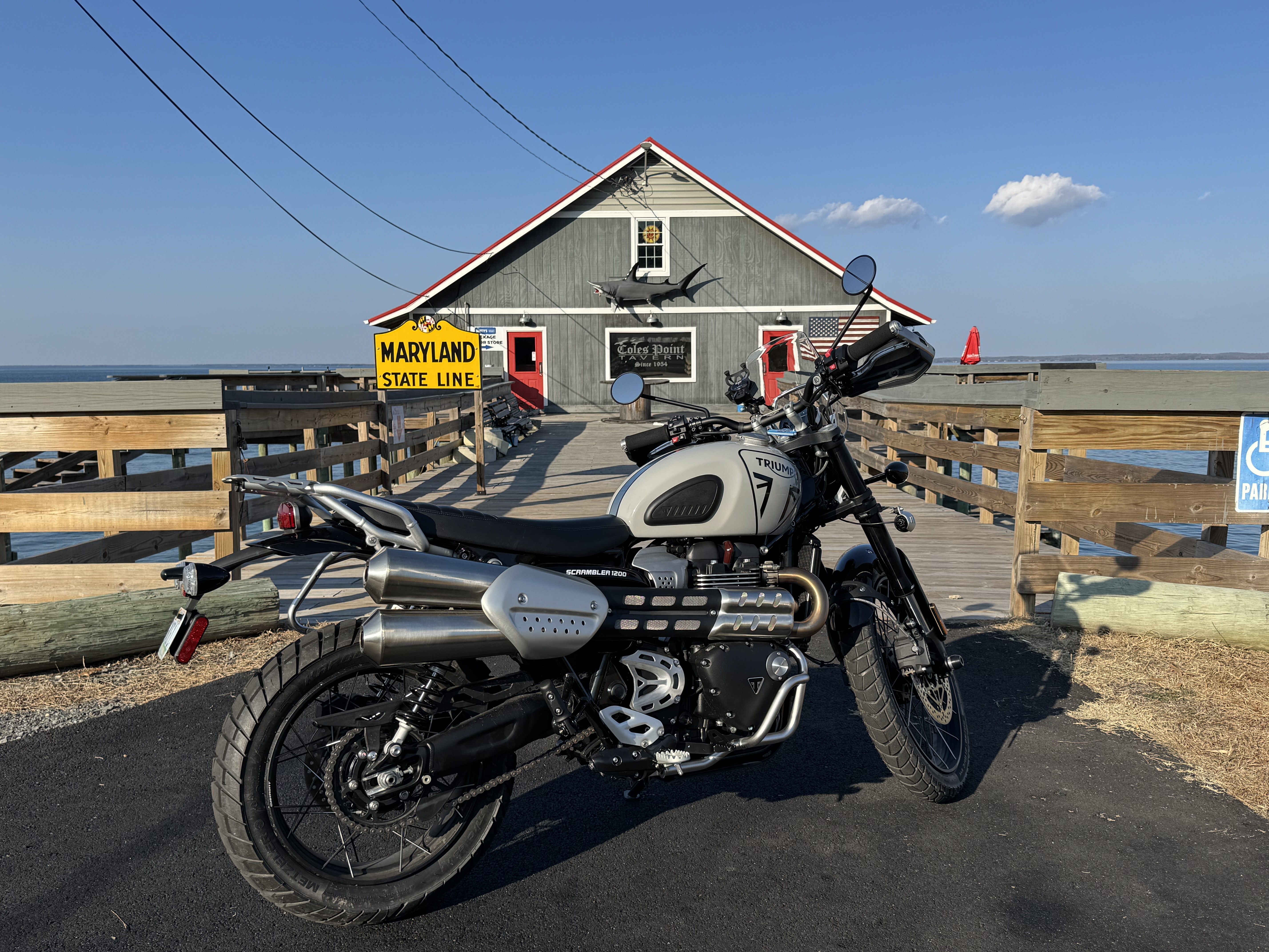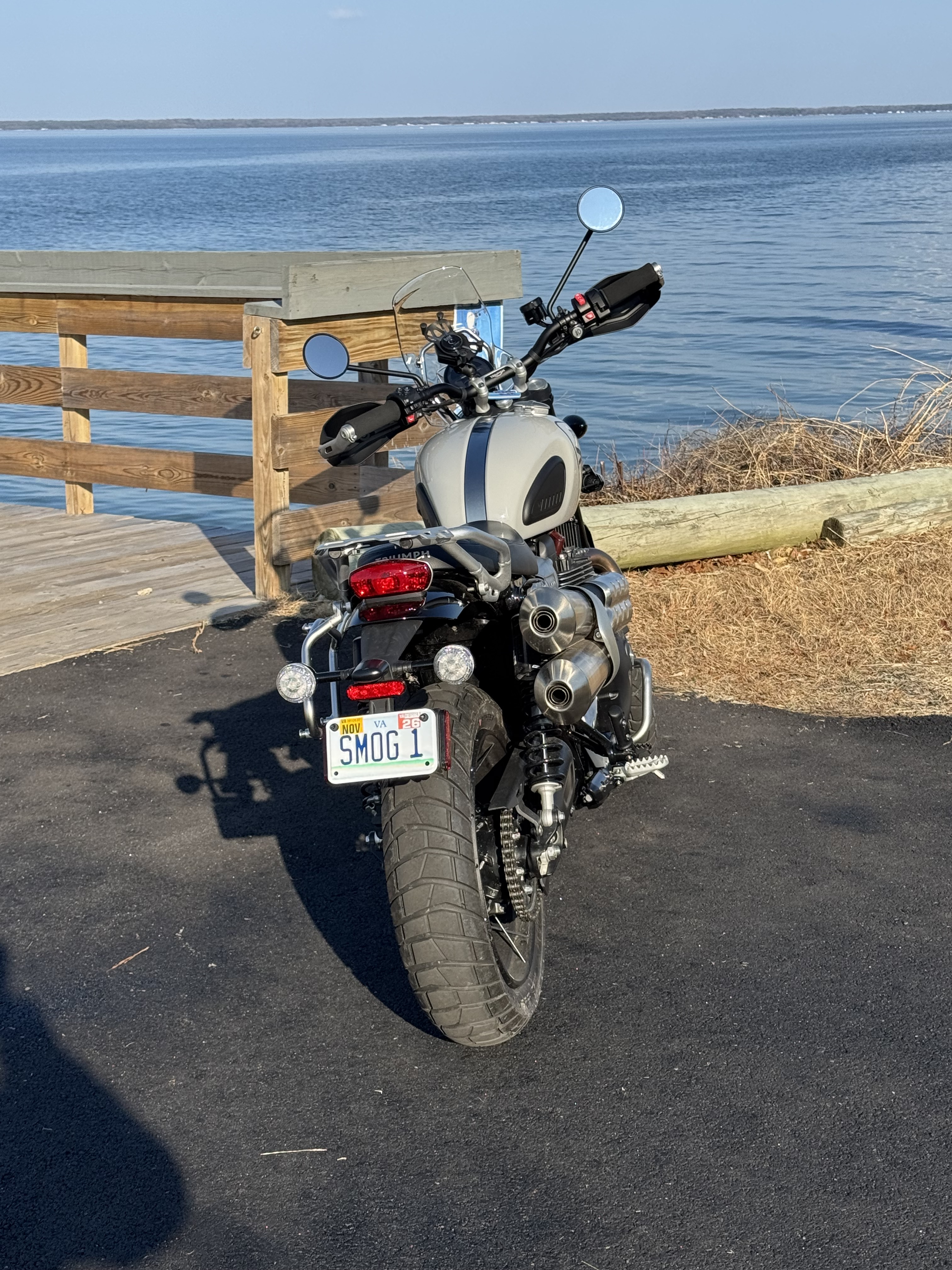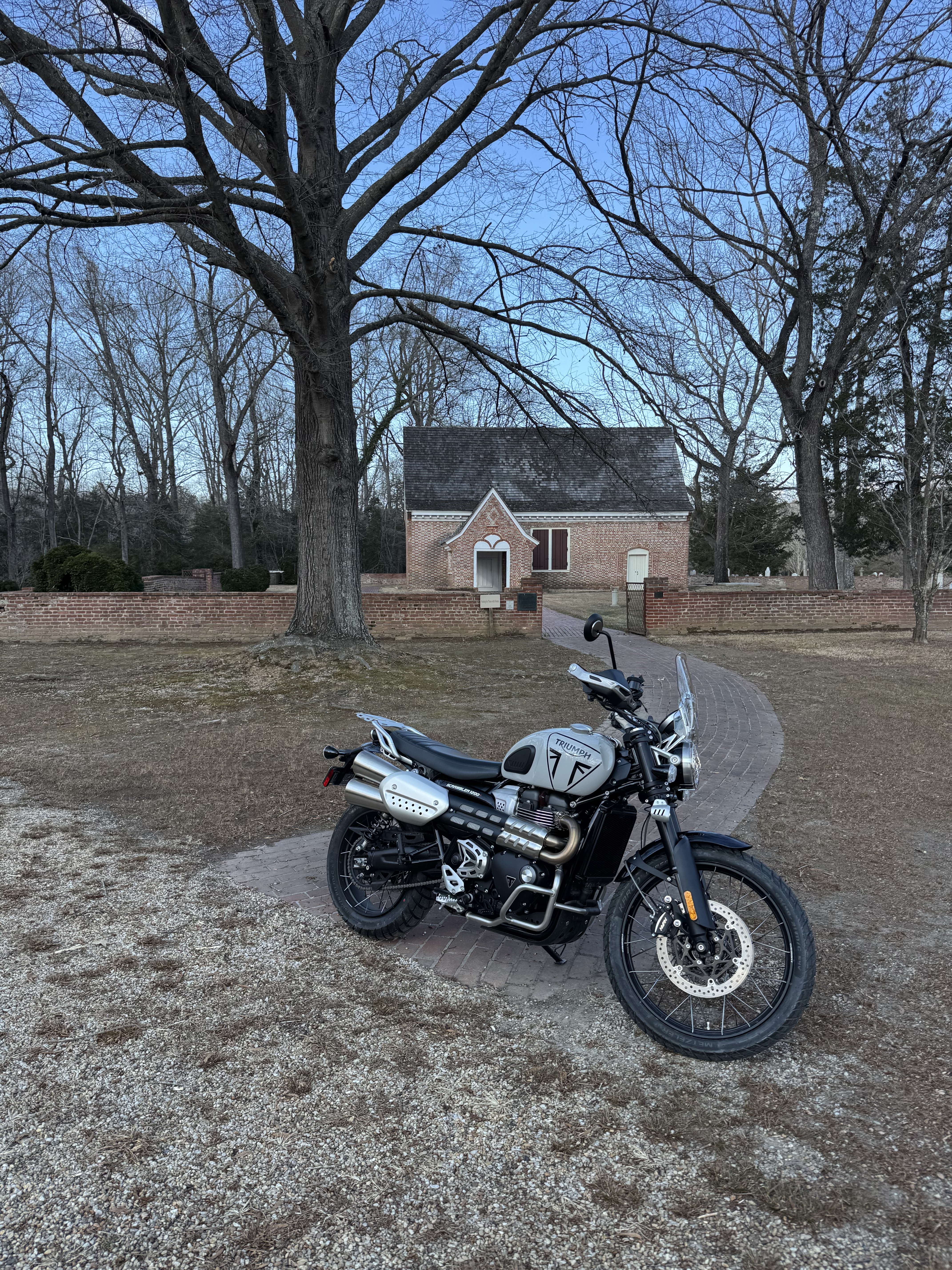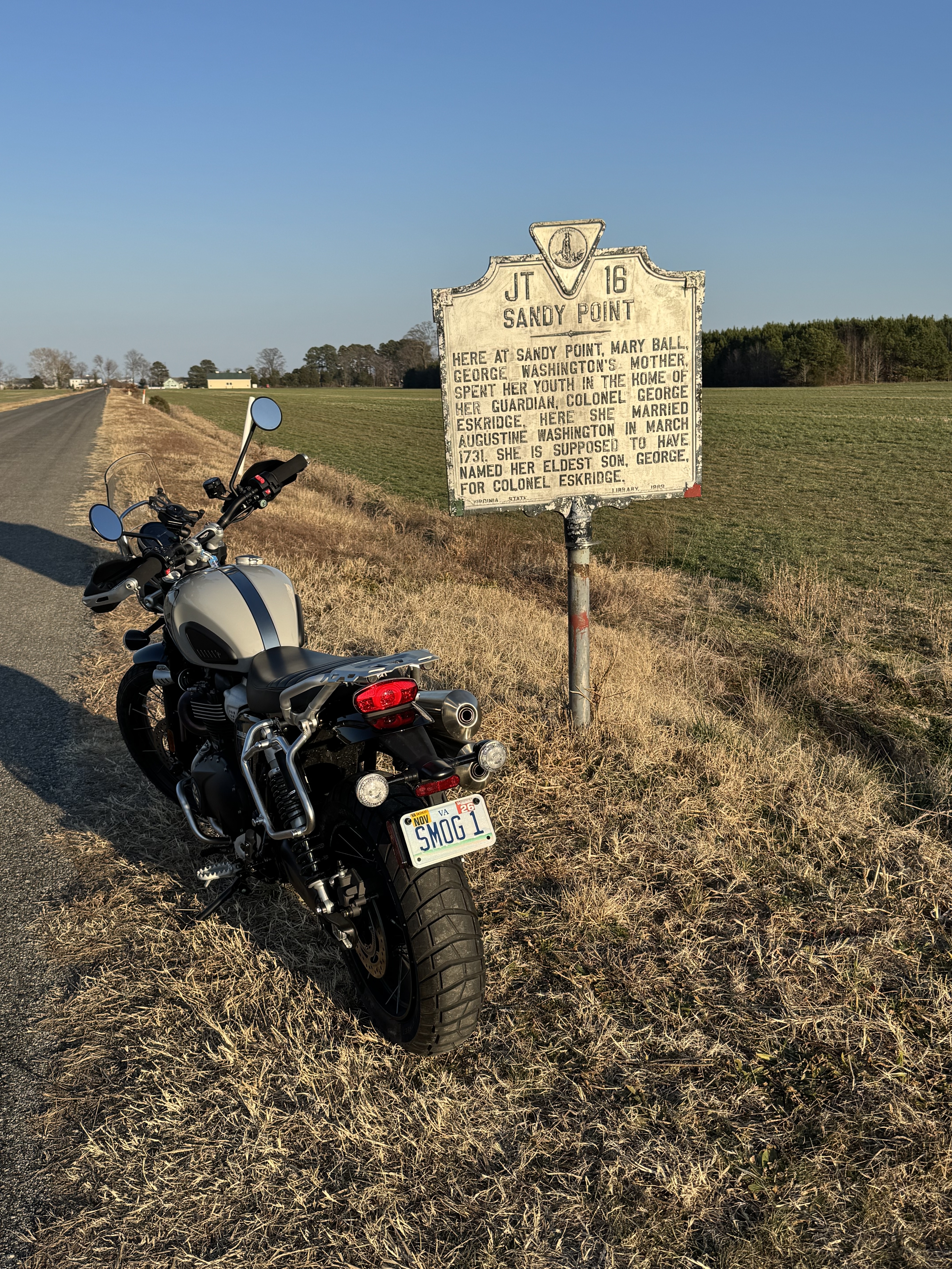 While Terry was in PT I got my 45 minute walk done. It was 69 degrees when we got home and I knew - Time To Ride. Took the new Scrambler out on the twisties of our Northern Neck (NN) of VA, riding the fields and forests, seeing some local sights, and just loving the warm weather. Photos in numerical order and attached: