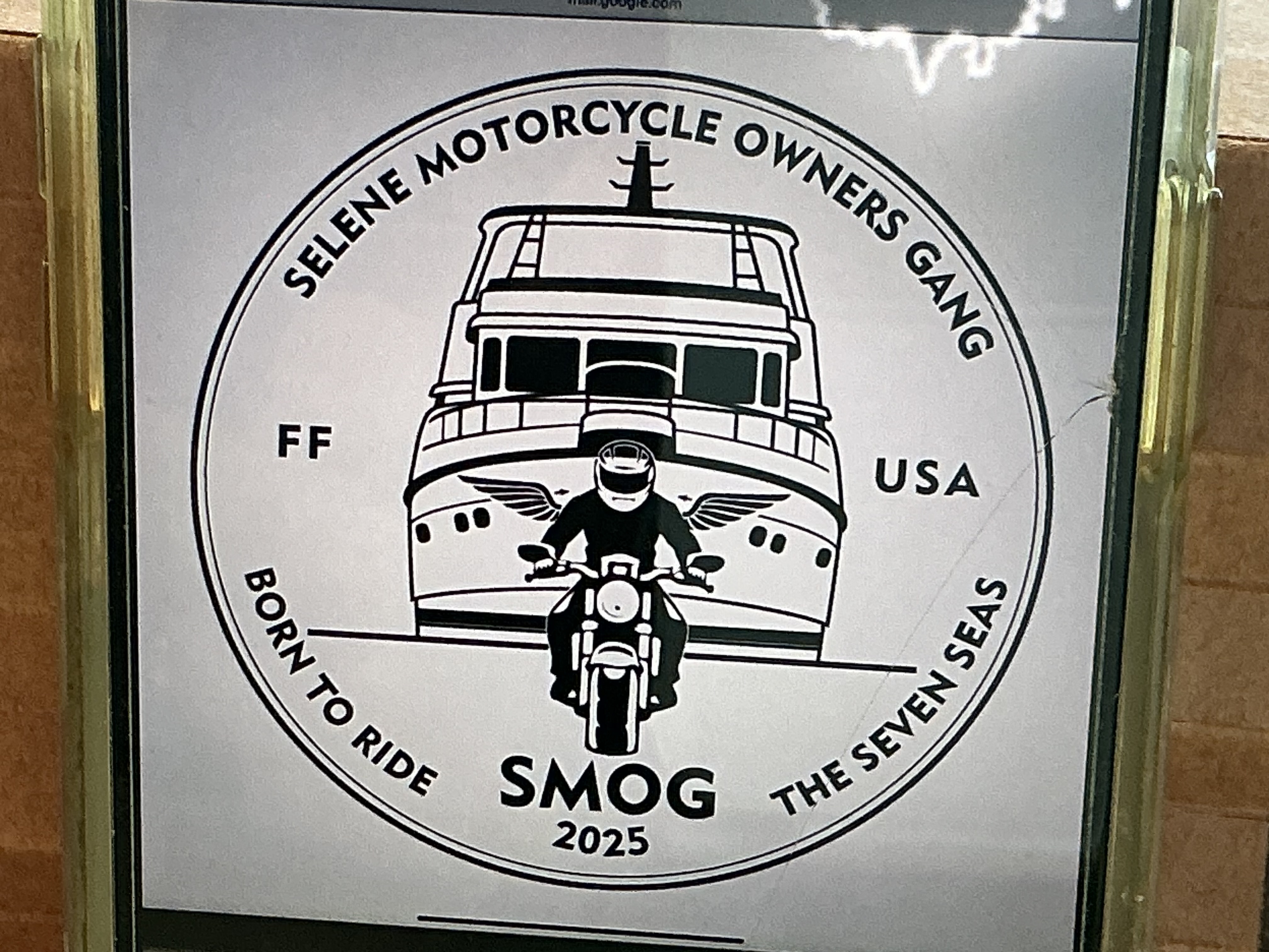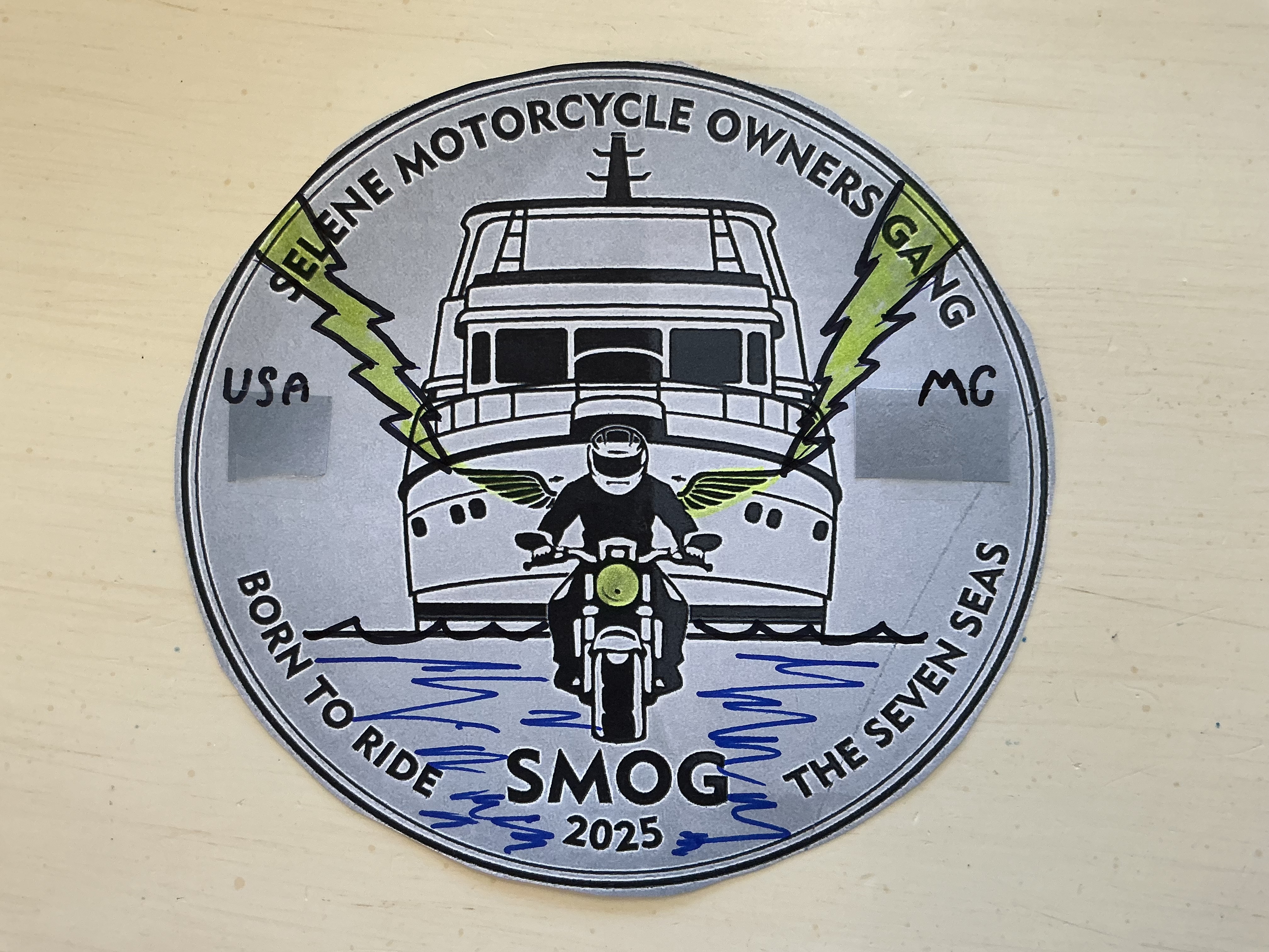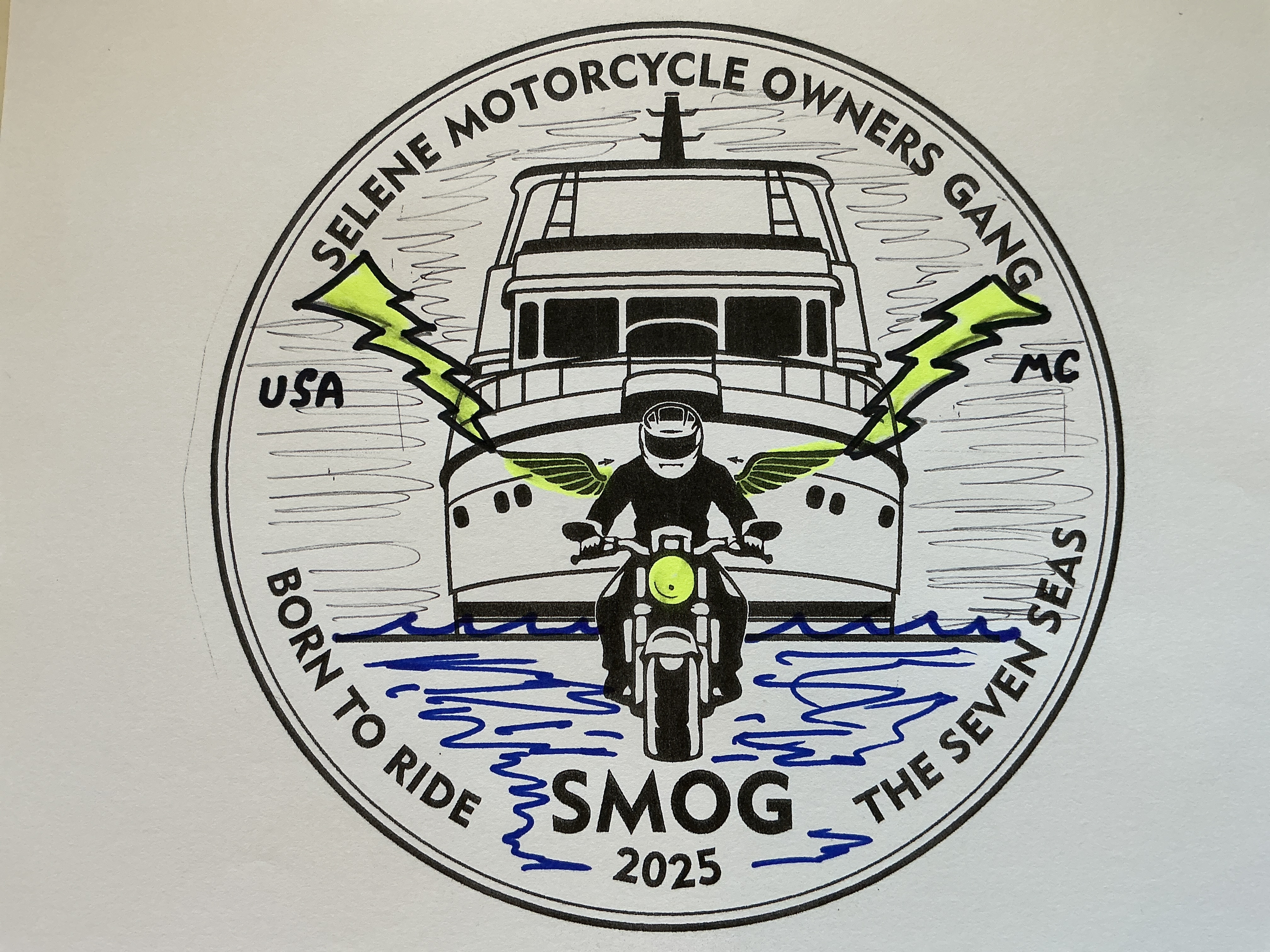 My edited version of Arina’s design is attachment two and includes all of the changes mentioned above, except the size of the central logo has not been downsized 15% as I don’t readily have the technology. Another thing that is missing is the “Planet Earth” language below the “SMOG” acronym which, in colors layout, demonstrates our territory. However, we do state “BORN TO RIDE THE SEVEN SEAS” which may be sufficient, but please comment. Keep in mind the less type the easier to design, create and read the colors.
