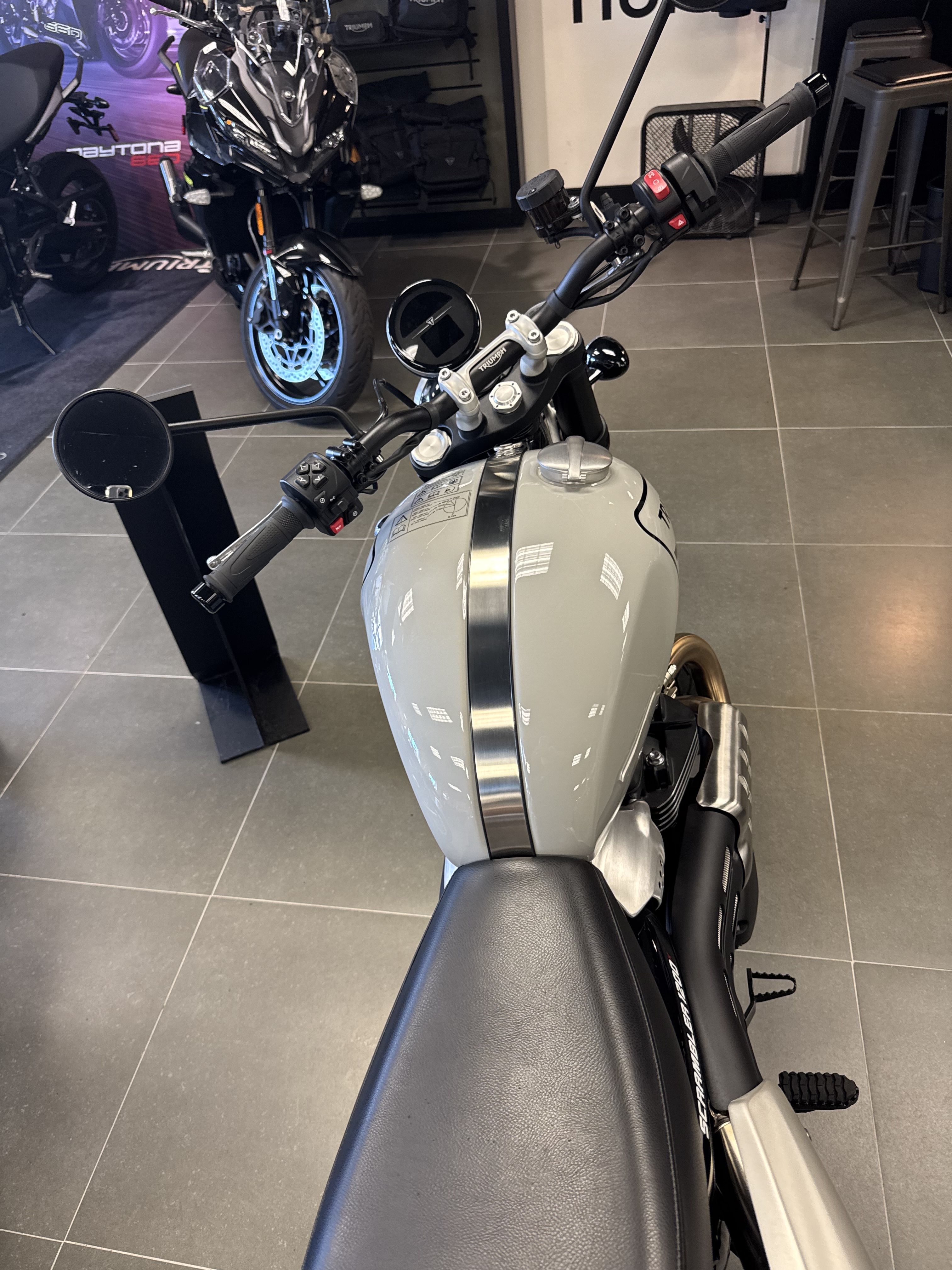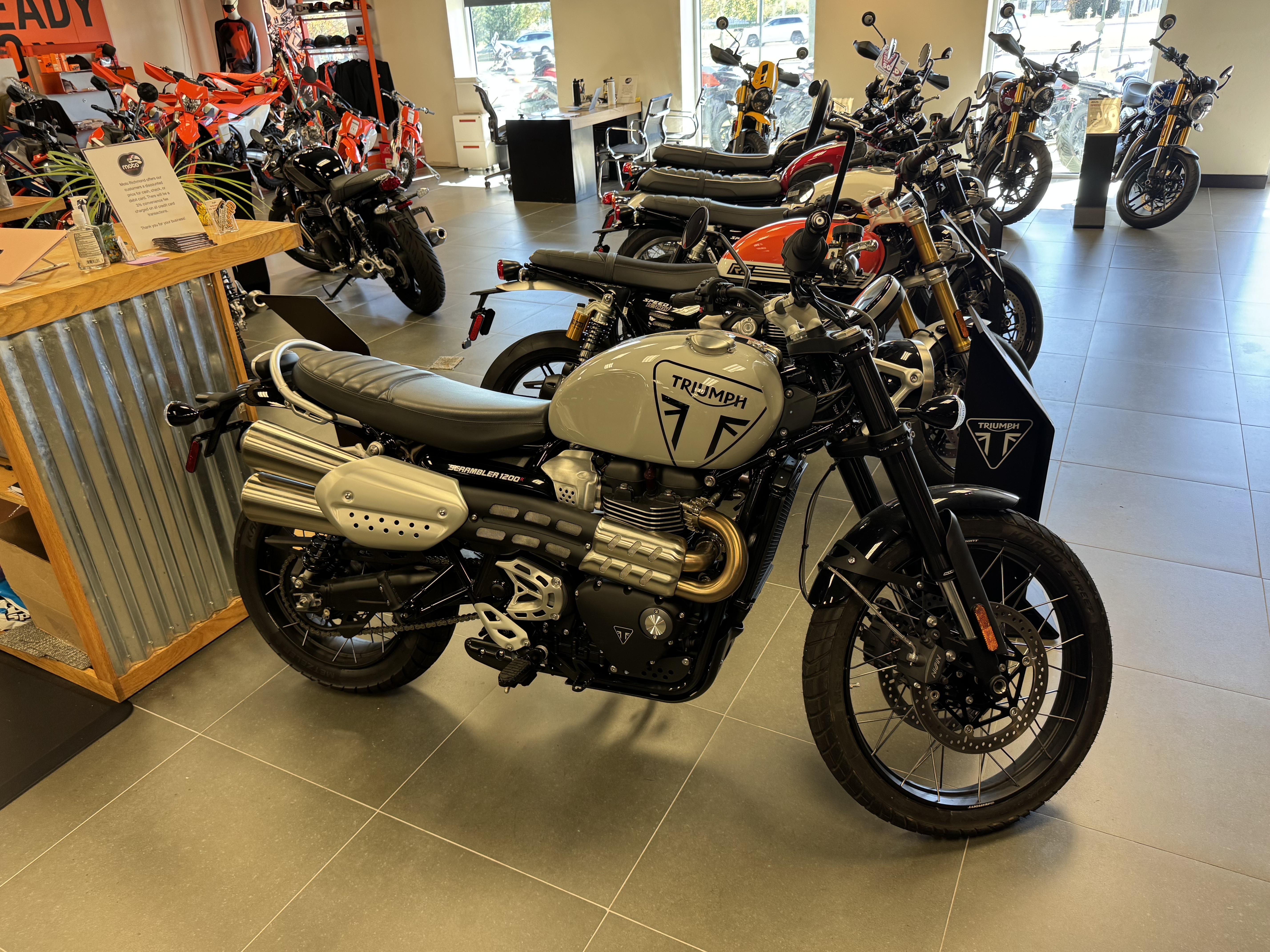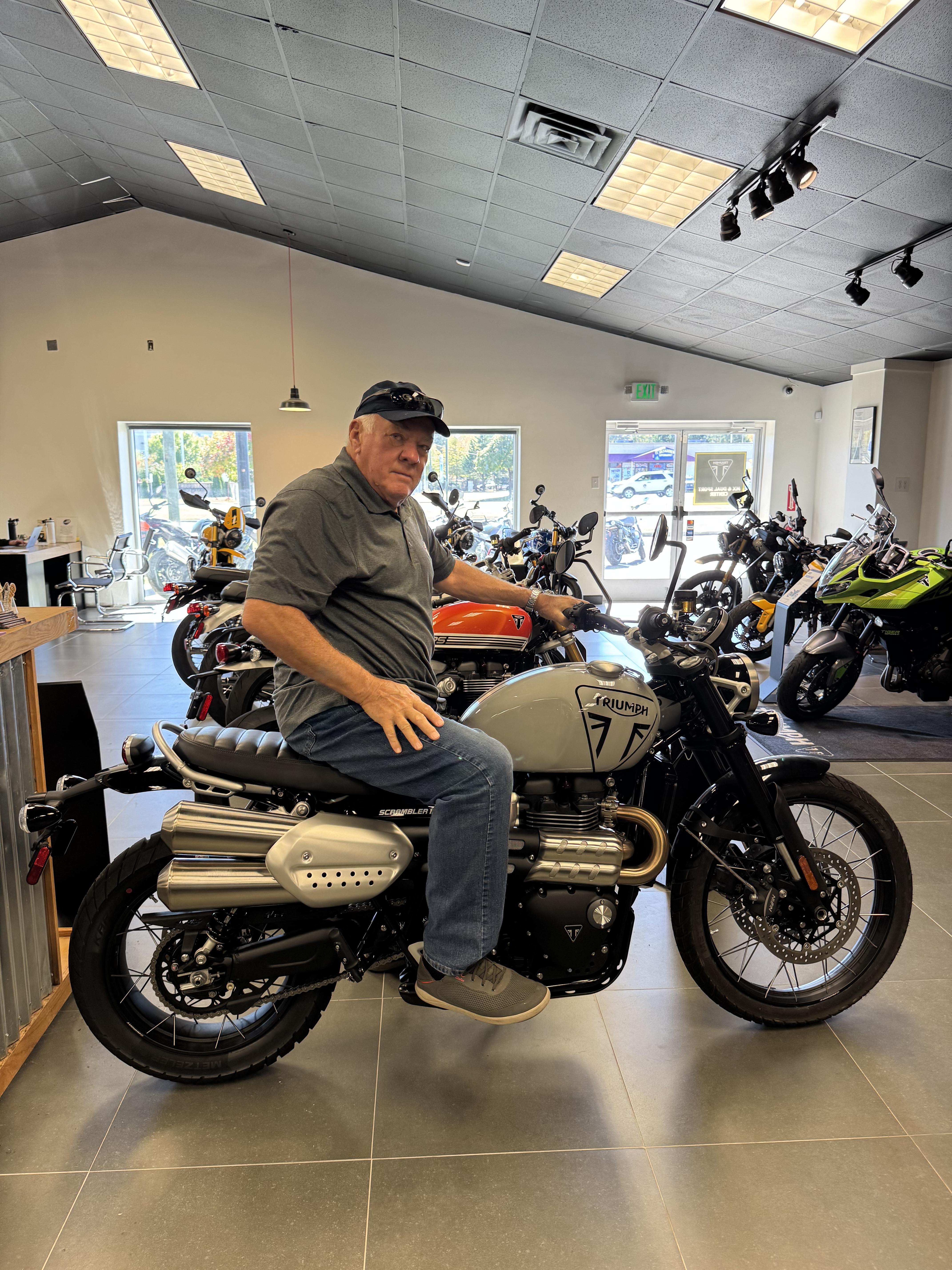 So, check out the attached photos of me and my brand new 2024 Triumph Scrambler 1200 X in Ash Gray. I will pick it up after Terry’s surgery on 10/30 and accessories are installed: windshield, fork protectors, dresser bars, left side pannier and luggage rack.