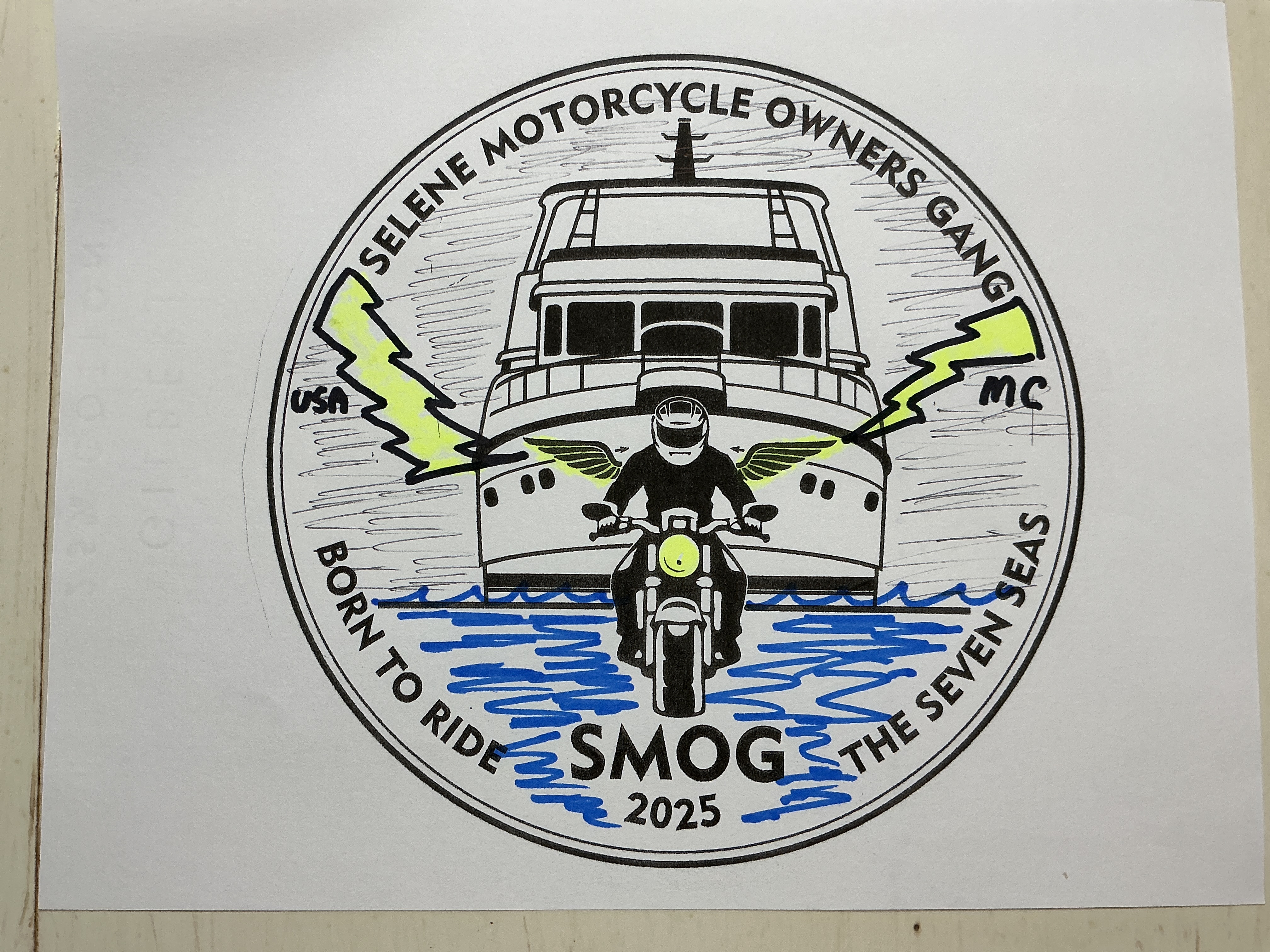 My edited version of Arina’s design is attachment two and includes all of the changes mentioned above, except the size of the central logo has not been downsized 15% as I don’t readily have the technology. Another thing that is missing is the “Planet Earth” language below the “SMOG” acronym which, in colors layout, demonstrates our territory. However, we do state “BORN TO RIDE THE SEVEN SEAS” which may be sufficient, but please comment. Keep in mind the less type the easier to design, create and read the colors.